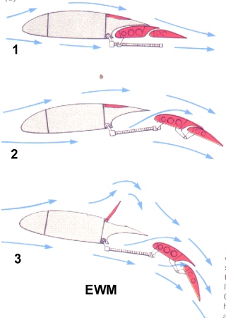 Pero a poca velocidad, cuando el piloto orientase las alas para conseguir la mayor sustentación posible, el aire pasaría a través de las ranuras y convertiría las aletas en planos aerodinámicos y aumentaría de este modo la sustentación.