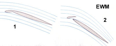 Gustav V. Lachmann, un piloto alemán fue el primero en proponer un dispositivo para reducir este peligro, su idea fue brillante, incorporo una o mas aletas auxiliares móviles, separadas por ranuras, en el borde de ataque de un ala de (abajo,arriba, figura 1).